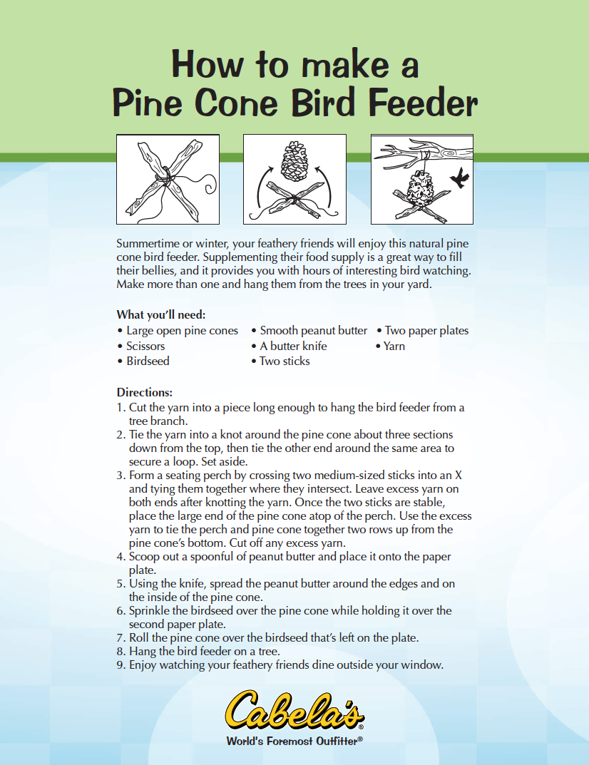 For step-by-step directions on how to make a pine cone birdfeeder, go to www.cabelas.com and type in the keyword: BIRDFEEDER