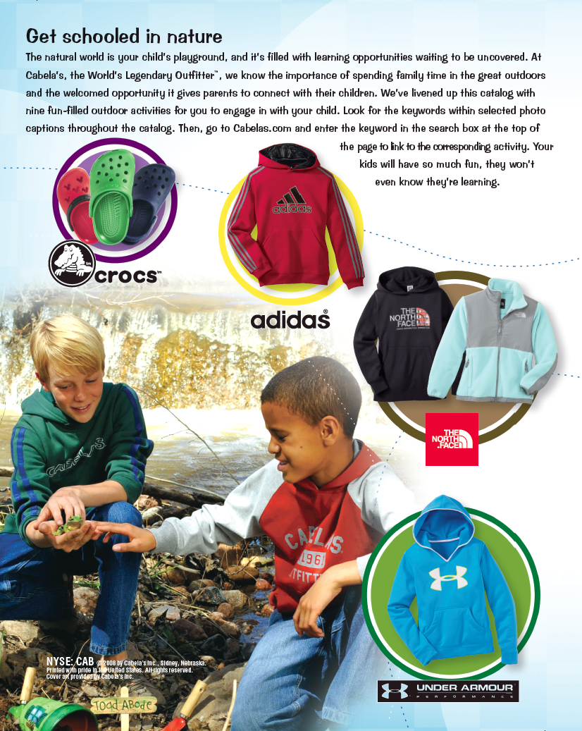 The natural world is your child’s playground, and it’s filled with learning opportunities waiting to be uncovered. At Cabela’s, the World’s Legendary Outfitter™, we know the importance of spending family time in the great outdoors and the welcomed opportunity it gives parents to connect with their children. We’ve livened up this catalog with nine fun-filled outdoor activities for you to engage in with your child. Look for the keywords within selected photo captions throughout the catalog. Then, go to Cabelas.com and enter the keyword in the search box at the top of the page to link to the corresponding activity. Your kids will have so much fun, they won’t even know they’re learning.